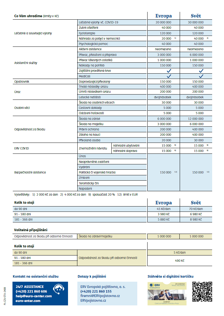 - ČZU pro cesty do zahraničí důrazně doporučuje cestovní pojištění od ERV. Pojištění u jiné pojišťovny je možné. ČZU však na základě pravidel programu Erasmus+ vyžaduje krytí těchto oblastí: