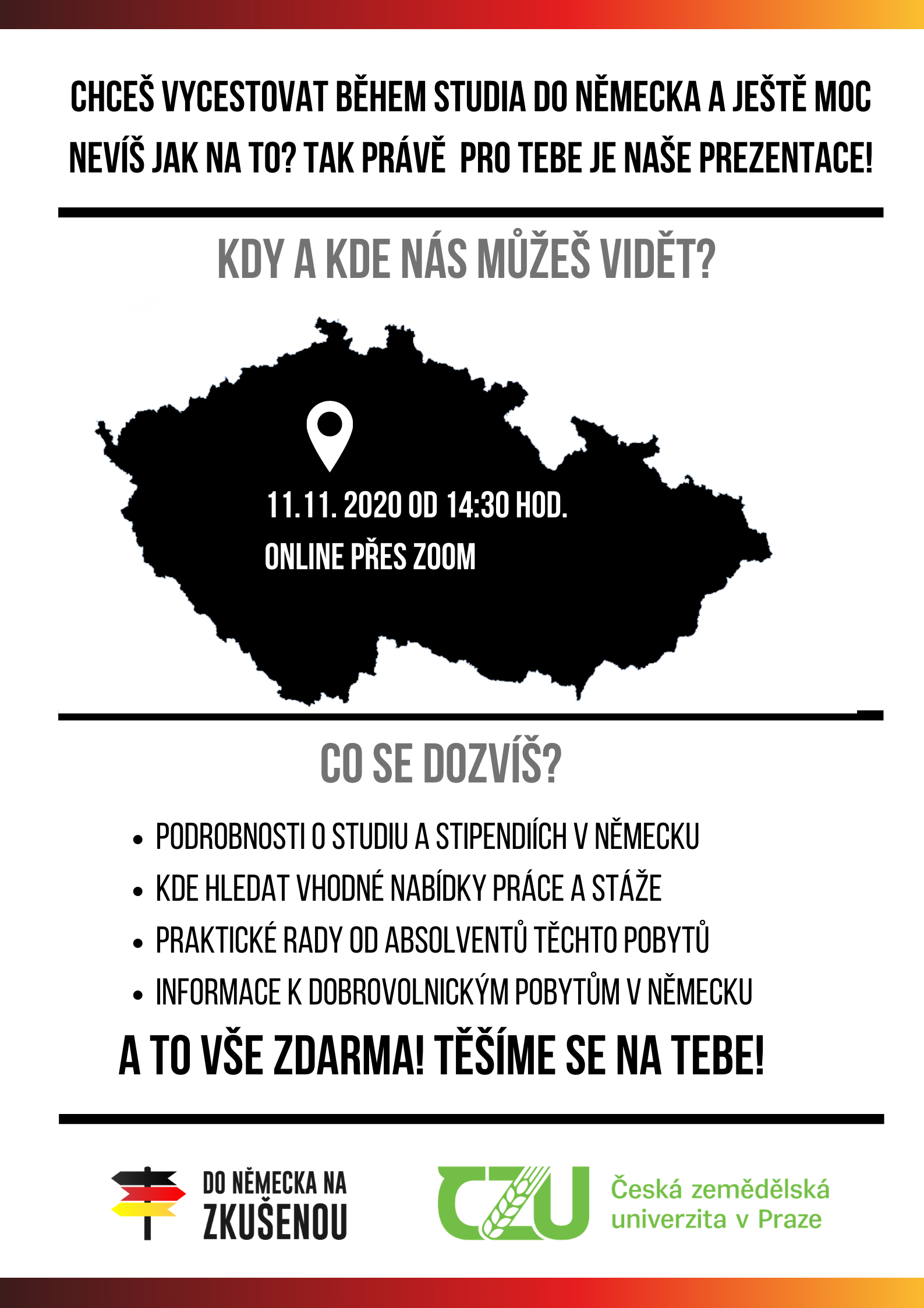 Chceš vycestovat během studia na vysoké škole do Německa a ještě moc nevíš jak na to? Rád bys vyjel co nejlevněji nebo úplně zadarmo? Chtěl/a bys ses dozvědět ještě o jiných nabídkách, než je Erasmus+? Chceš se ucházet o stipendium a nevíš, co je k tomu vše potřeba? Tak neváhej a přijď se podívat na naši prezentaci!