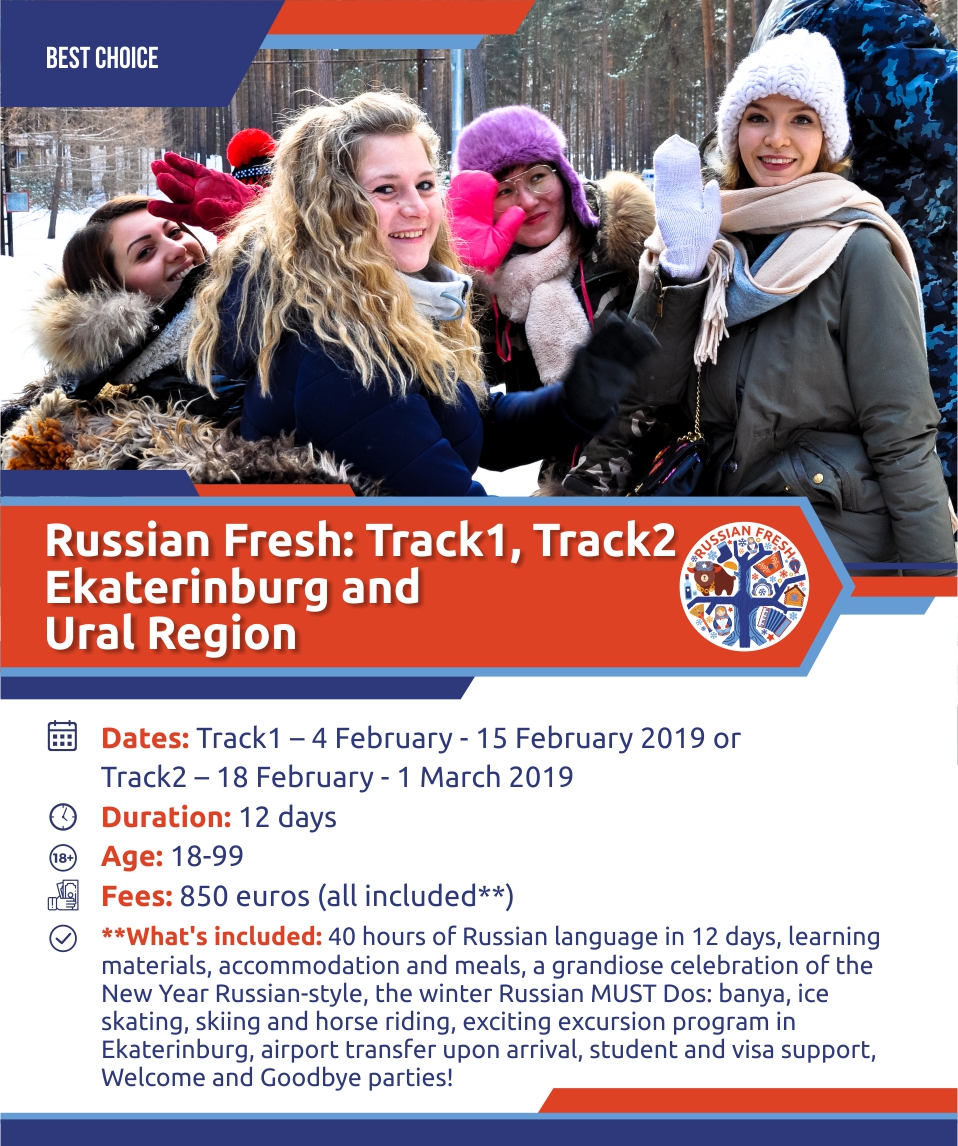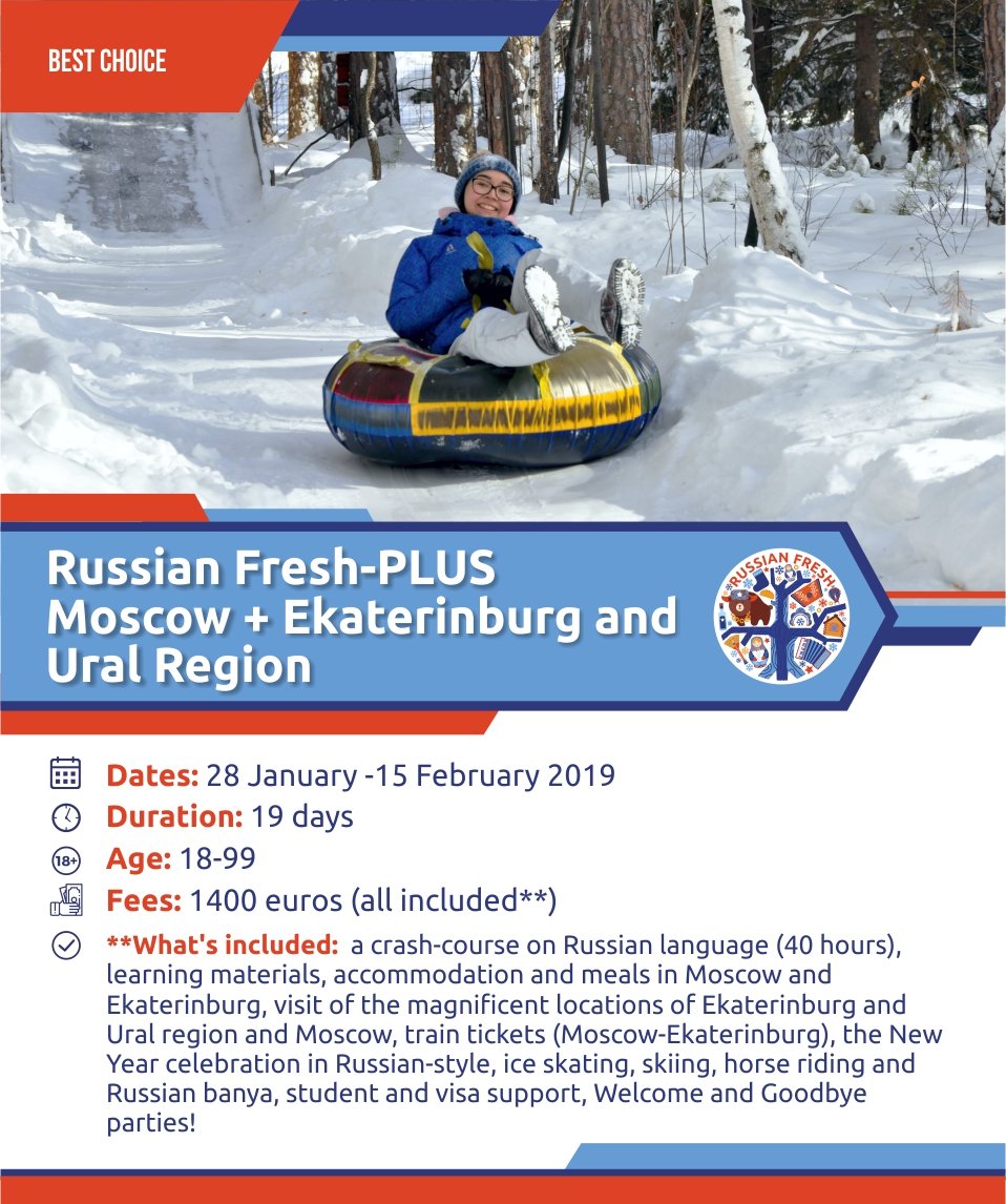 40 hodin výuky Ruského jazyka ; tematické výjezdy do kouzelné přírody na Urale, kulturní programy, nvoroční slavnosti v zasněžené ruské zimě, tradiční ruské radovánky, jízda na koni, atd. Na závěr kurzu účastníci navštíví Moskvu. Více informací na: http://russtudies.com/en https://russtudies.urfu.ru/en/russian-language-schools/russian-fresh-and-russian-fresh-plus-winter-schools/