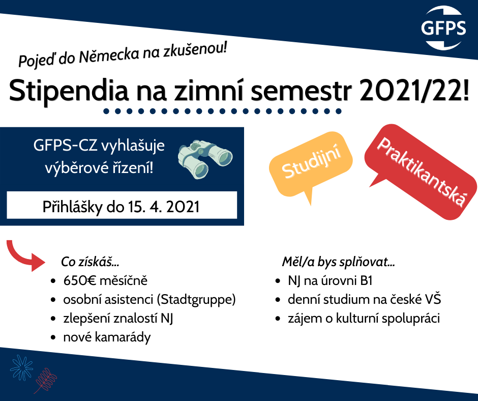 Organizace pro studentskou a kulturní výměnu ve střední a východní Evropě (GFPS-CZ) informuje, že bylo vypsáno výběrové řízení na poskytnutí stipendií na zimní semestr 2021/2022 do Německa!