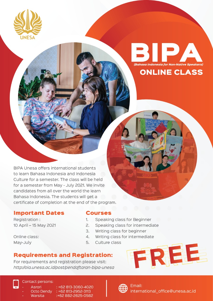 - Online application : http://oia.unesa.ac.id/page/formulir-pendaftaran-bipa-unesa