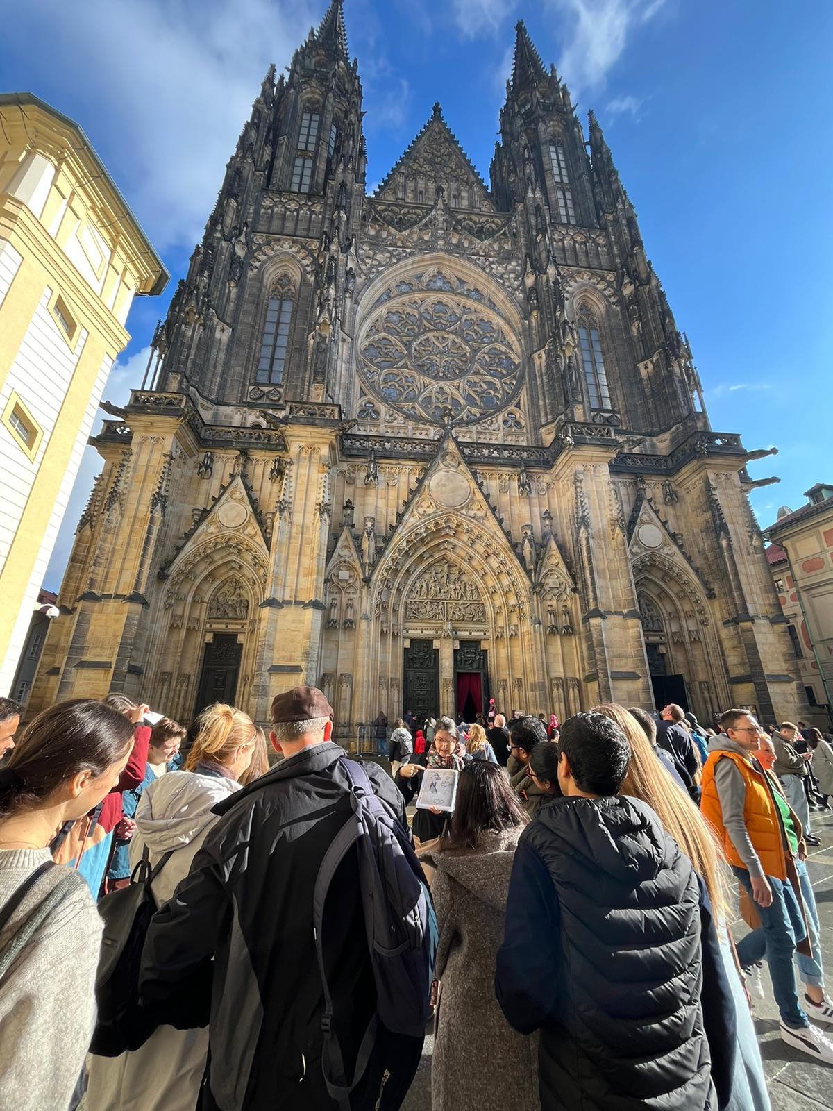 The tour started at the North entrance, and from there, we continued our way into the magnanimous St. Vitus Cathedral. Amongst many beautiful things, we saw modern 20th-century stained glass windows there, and among them was a window painted by the famous Czech painter Alfons Mucha. We also got to see the silver tomb of the Czech Catholic saint John of Nepomuk (Cs: Jan Nepomucký) and tombstones of Czech Premyslid kings and three members of the Habsburg family (two kings and a queen). Noticeably, the most important Czech Saint is buried in the cathedral – St.Wenceslas. The cathedral mixes Gothic (the old part), Renaissance (the wall with the organ in the transept) and Neo-Gothic (the new part) architectural styles. Its construction started in 1344 at the time of Charles IV and finished only in 1929. Yet another thing that our guide Alena pointed out was that the Last Judgement had been depicted twice, once outside in the mosaic above the Golden Gate entrance and once inside on the biggest stained glass window in the transept.