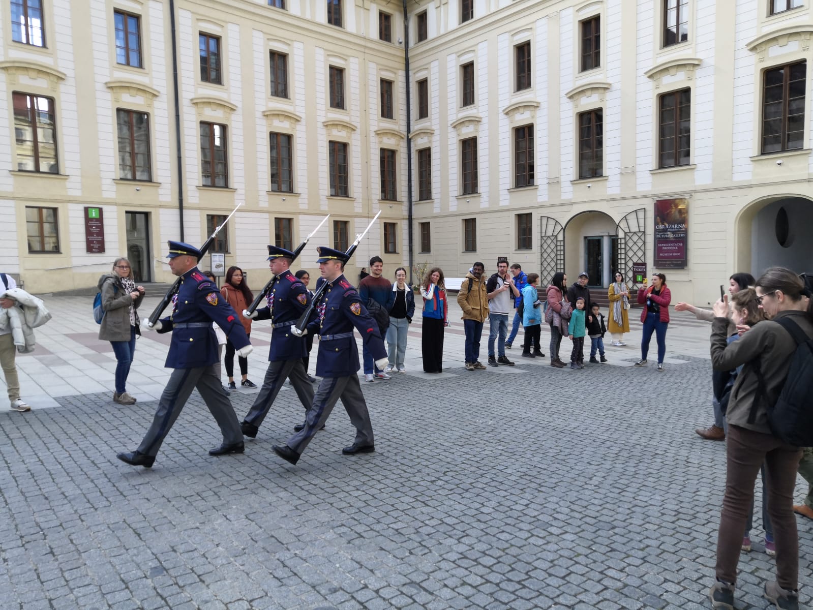 The tour continued to the Castle where we headed first to see the beautiful Italian Garden in the 4th courtyard. A very charming fact that our guide, Jiřina made us all test was the fact that if you stand at the centre of the small staircase facing the garden and are tall enough, whatever you say will audibly echo back just to you as if you’re having a conversation with yourself. When each of the participants from our group was testing this fact one after the other, we realised that it was time for the change of guards. We hurried to the internal courtyard to watch the change of guards. But to our surprise, the Castle clock was running a few minutes earlier and the change had therefore started earlier than we expected. So, we only got to see the change from inside.