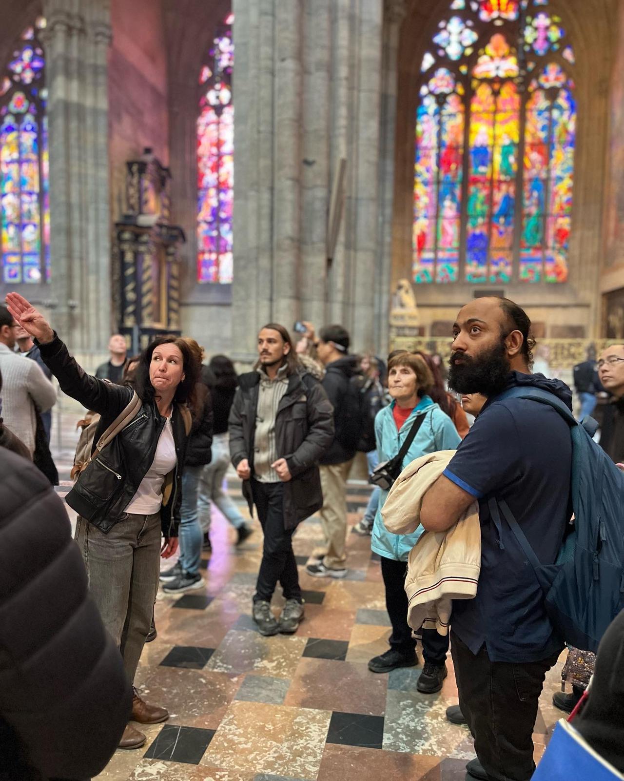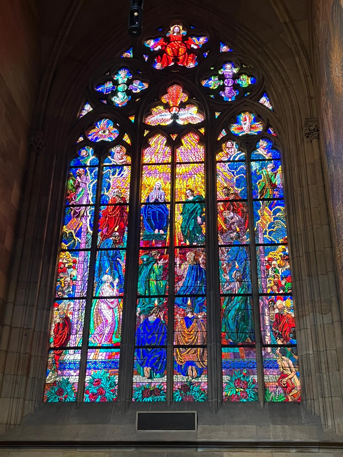 The window sponsored by a bakery featuring someone holding a pretzeling been commissioned in 1344, it was completed only in 1920s and elements from all these different periods can be seen in this church, including symbolic imagery from modern institutions which sponsored the various windows of the cathedral. We took a short resting break before we continued the tour. During the rest, Jiřina continued to inform us about King Charles IV and how he liked to take part in jousting tournaments disguised as a knight, as no one wanted to fight the King himself, and how one of these tournaments caused him a life-threatening injury that left him disfigured with a hunchback, which we later saw depicted on the other door of the Cathedral.