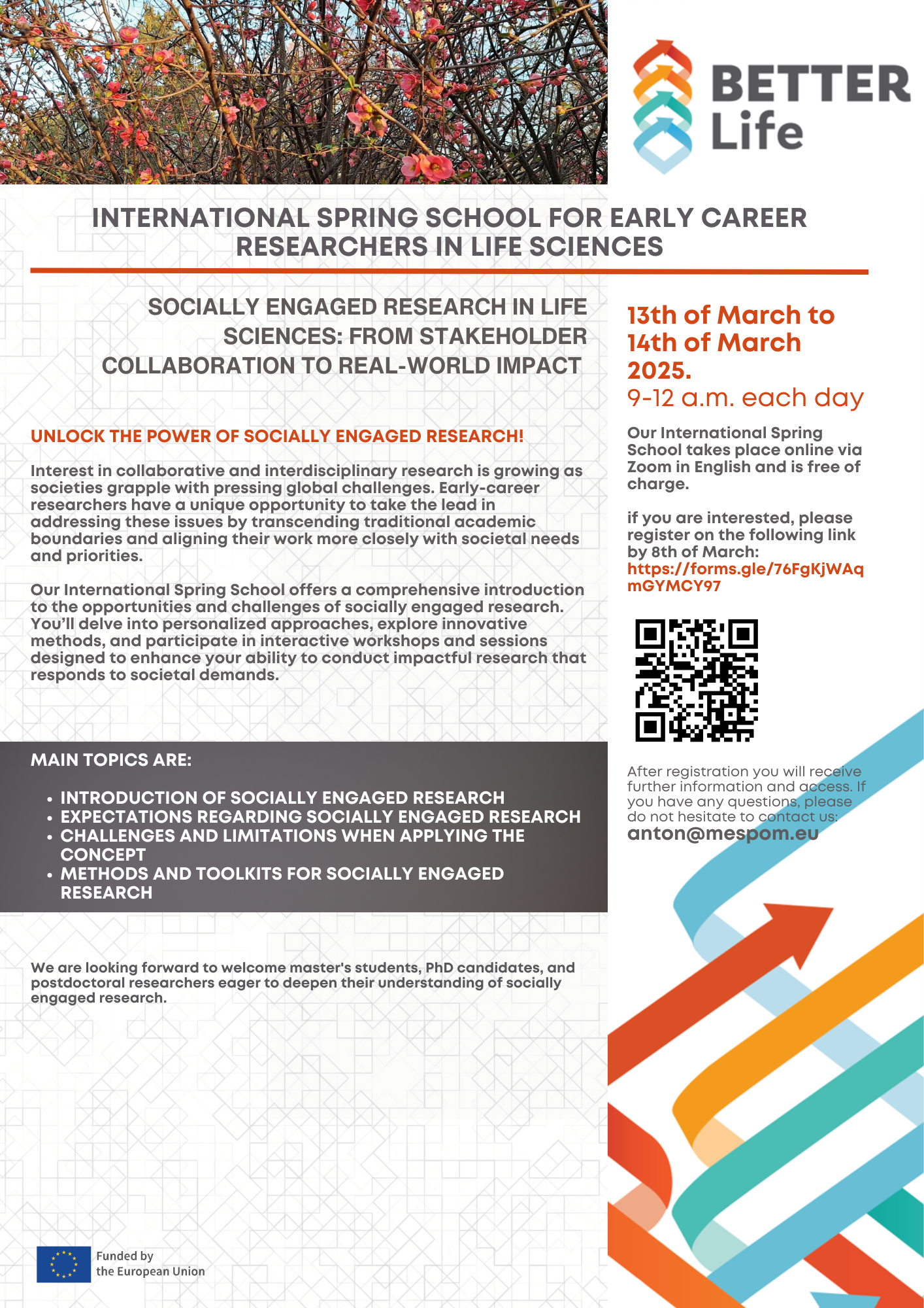 The International Spring School for Early Career Researchers in Life Sciences provides a comprehensive introduction to the principles, methodologies, and real-world applications of socially engaged research. Through interactive workshops, expert-led discussions, and collaborative activities, participants will gain insights into conducting impactful research that fosters meaningful stakeholder engagement.